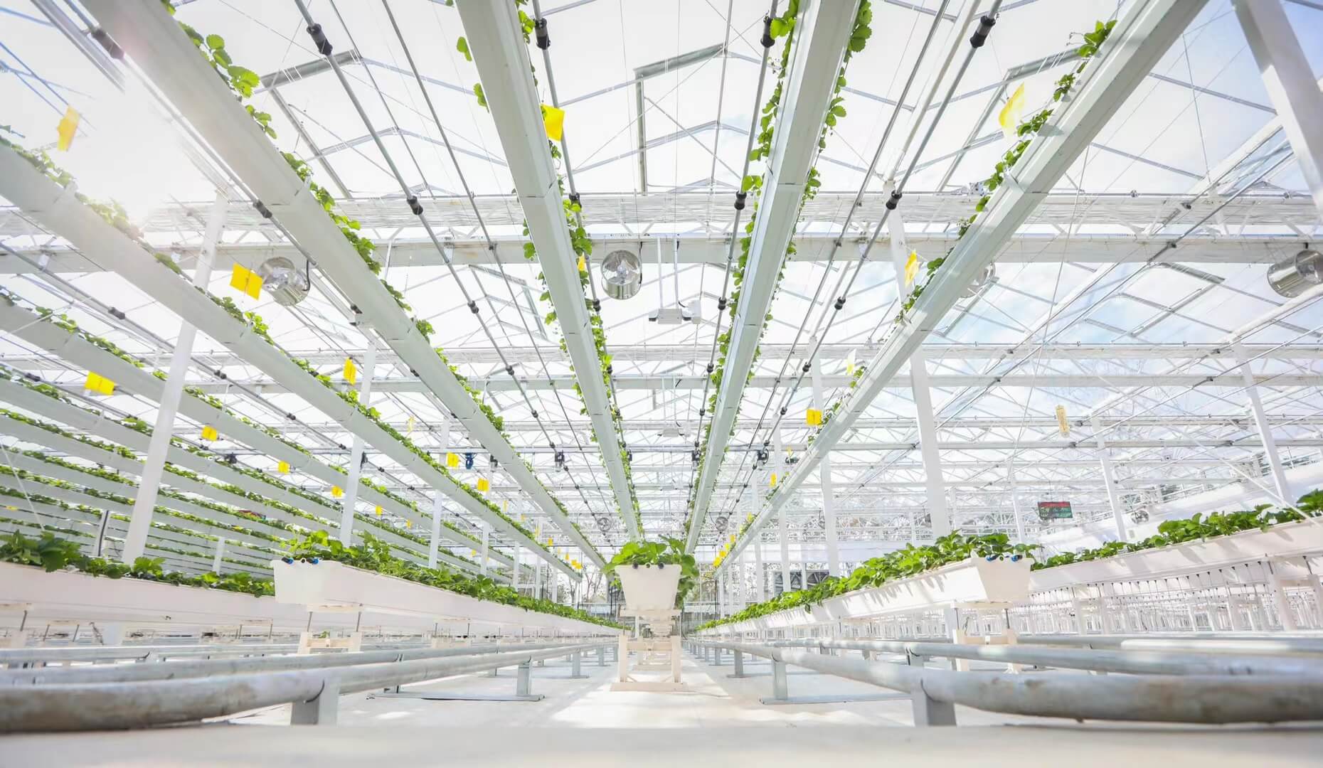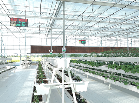 天瀑栽培系统,应用于草莓及叶菜类种植,采用可升降式立体栽培装 置,智能终端控制、自动化升降,采摘方便、造型美观、科技感十足。