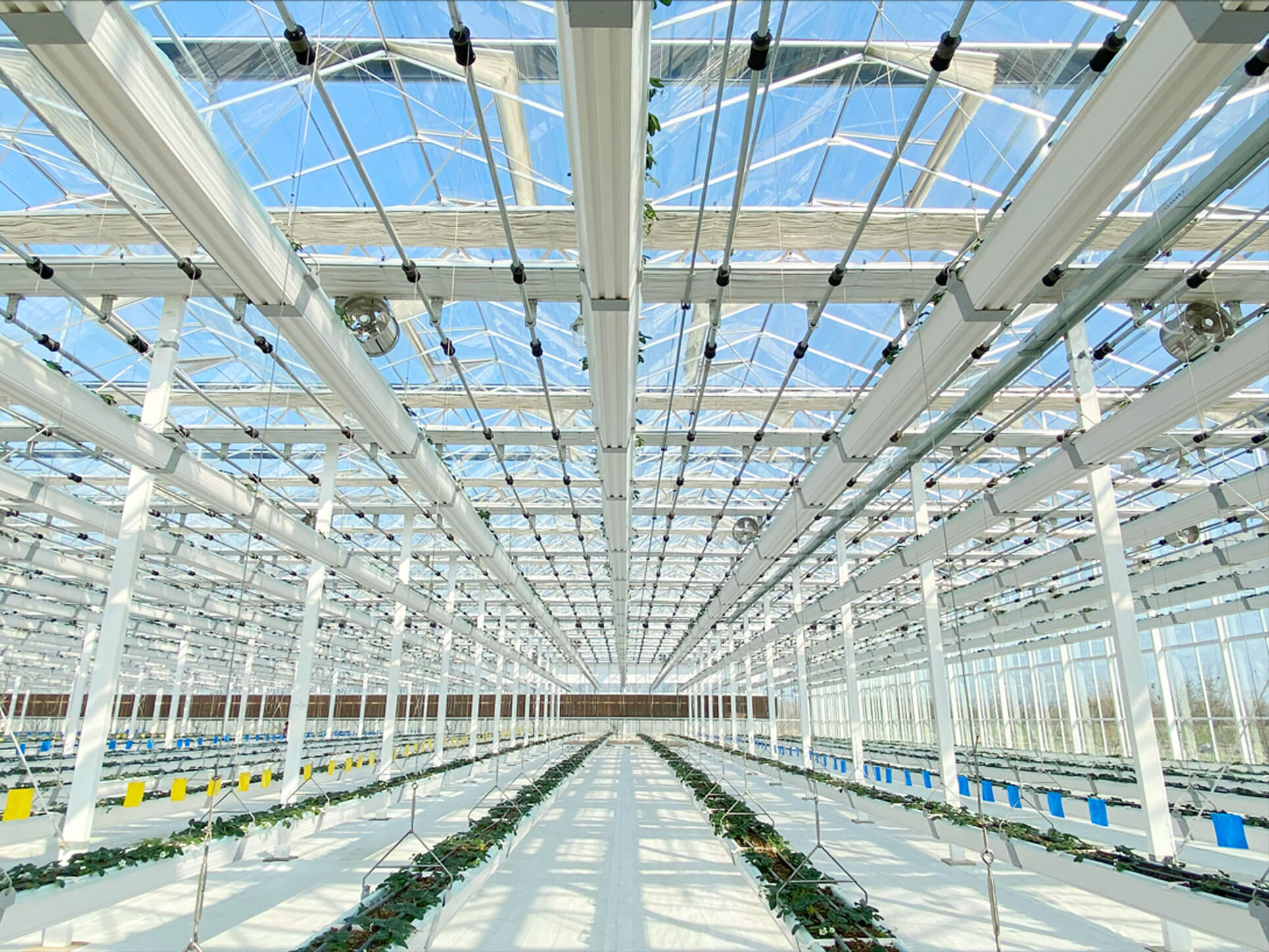 悬挂式栽培系统,应用于茄果、瓜果等多品类种植,立体栽培有利于提升空间利用率,栽培架悬挂于空中便于生产操作,无土栽培避免土传病虫害,有效提升栽培品质及产量。