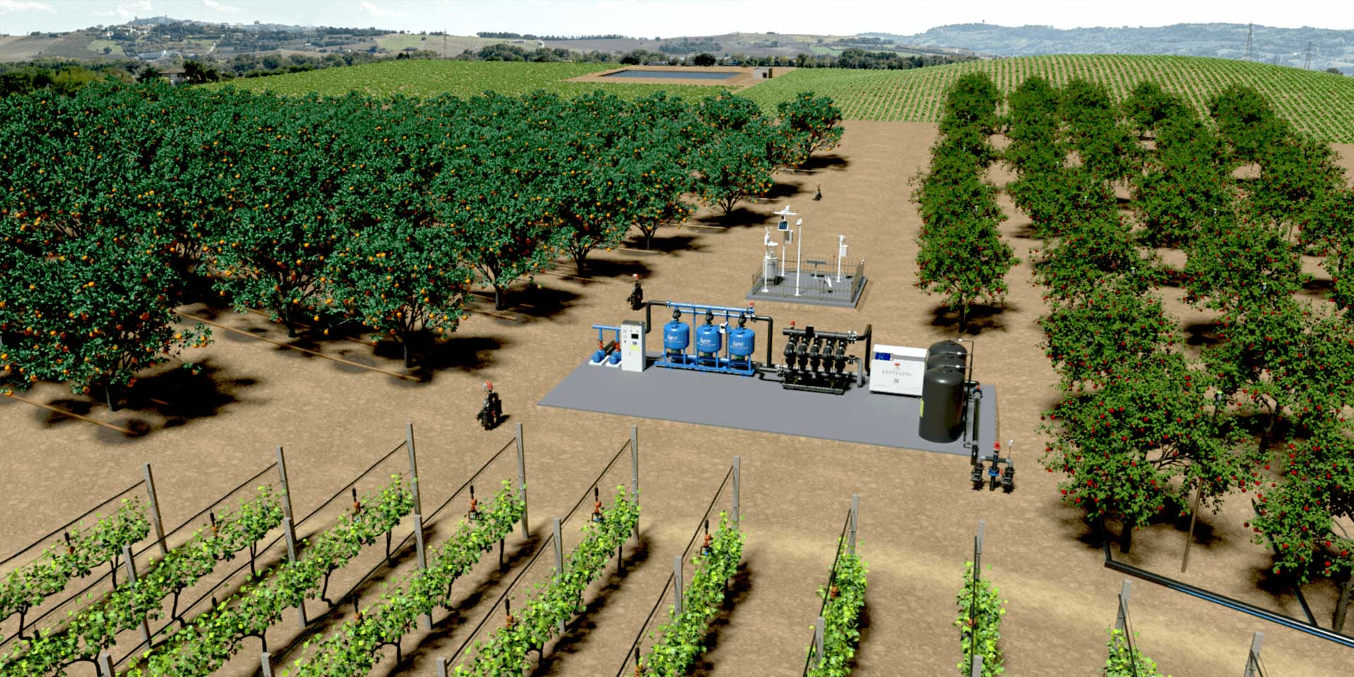 灌溉系统的首部枢纽包括纯水处理系统、过滤设施、施肥设备、控制设备、安全保护及量测设施等部件。其作用是从水源取水加压,并加入肥料或农药,经净化处理,担负着整个灌溉系统的加压、供水(肥、药)、过滤、量测和调控的任务