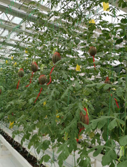 吊蔓: 小西瓜采用吊蔓栽培,一方面能充分提高温室内的空间利用,同时方便日常整枝、授粉等操作,改善了底部通风透光条件。