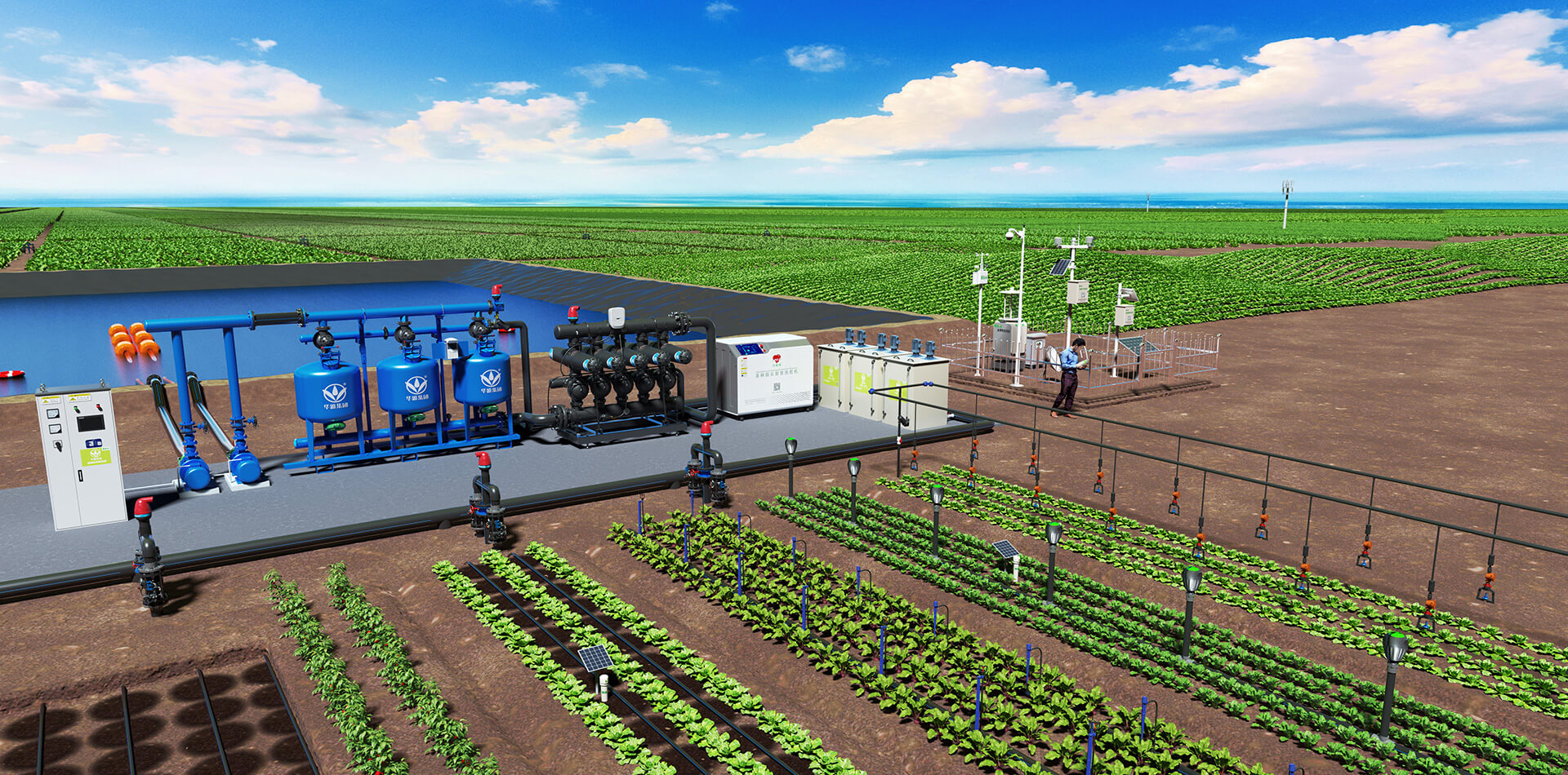 灌溉系统的首部枢纽包括纯水处理系统、过滤设施、施肥设备、控制设备、安全保护及量测设施等部件。其作用是从水源取水加压,并加入肥料或农药,经净化处理,担负着整个灌溉系统的加压、供水(肥、药)、过滤、量测和调控的任务