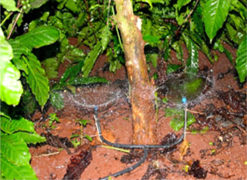 咖啡根系的80%集中在0~30cm深的地表,采用微喷灌和滴灌有利于根系对养分的吸收,结 合水肥一体化可有效节肥30~50%。