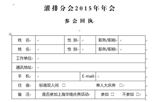 1、请各单位参会代表于2015年12月25日前将此表及付款凭证以电子邮件的方式发至灌排分会,灌排分会秘书处与承办方将按此表预定和安排房间;灌排分会电子邮件: [email protected];