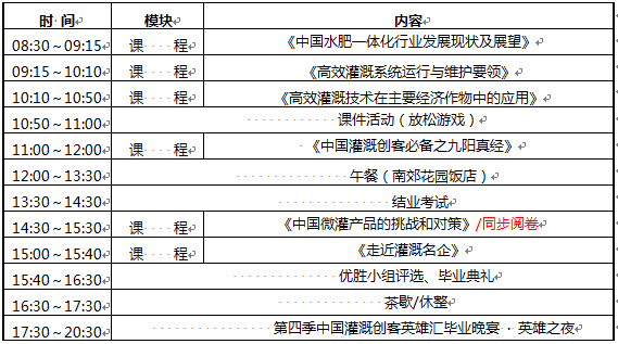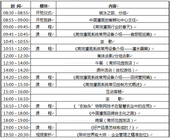 本季培训班得到了中国灌区协会微灌分会、中国氮肥工业协会水溶肥分会的大力支持。被业界誉为“中国水肥一体化司令”的重量级神秘嘉宾更将亲临授课,蝉联“中国灌排行业优秀青年企业家”、荣获“上海市农业领域十大领军人才”的业界大咖将倾情演绎其十五年风雨阳光创业路,中心课程开发小组精心准备的实操性极强的定制大餐期待创客英雄豪享!
