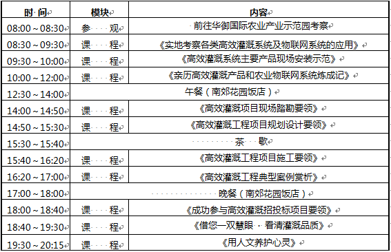 4、面向水利设计院灌溉项目设计师,农业技术推广人员,温室公司、农场基地、种子农资等相关企业的灌溉业务主管,大型灌溉项目运维人员等开放部分名额。