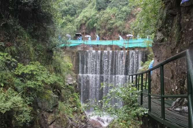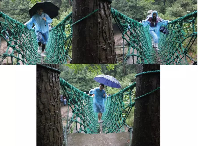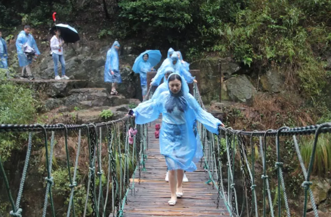 瀑布上的吊桥,小姐姐走的额外小心翼翼。