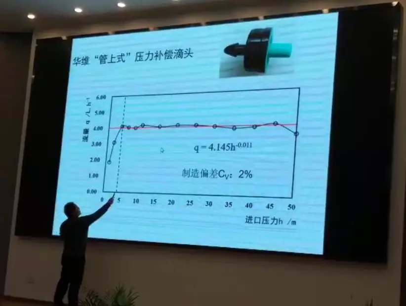 李光永教授在报告中专门以华维历时两年多研发成功、填补国内空白的1828压力补偿滴头为例,做了详细的阐述。根据他亲自安排做的性能测试报告,李光永认为华维的1828滴头在超低的起始压力和超高的高位压力两方面的表现都超过了目前世界上最好的国外同类产品,且全过程流量稳定性极佳,完全达到了世界领先水平,并称“中国的企业是非常了不起的!”