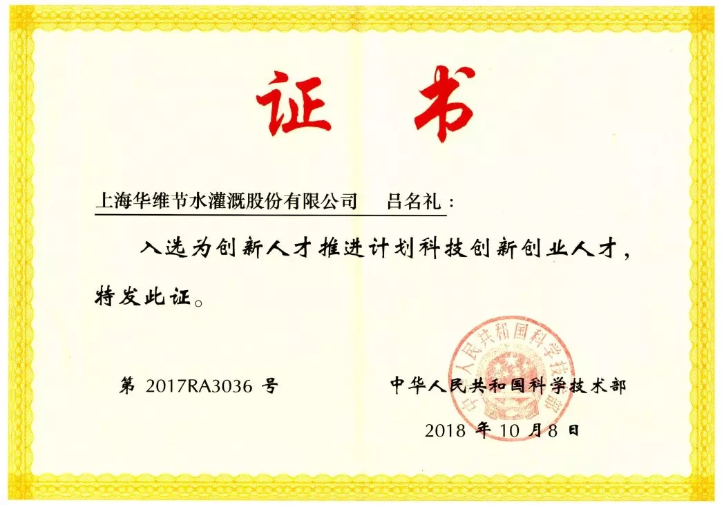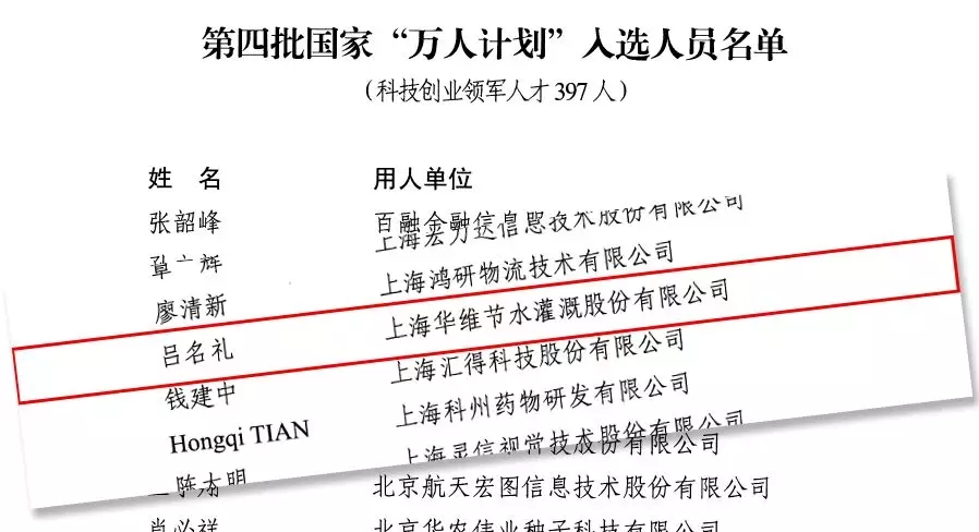 近日,根据《中共中央组织部办公厅关于印发第四批国家“万人计划”入选人员名单的通知》,华维集团(原上海华维节水灌溉股份有限公司)董事长吕名礼入选第四批国家“万人计划”科技创新领军人才。