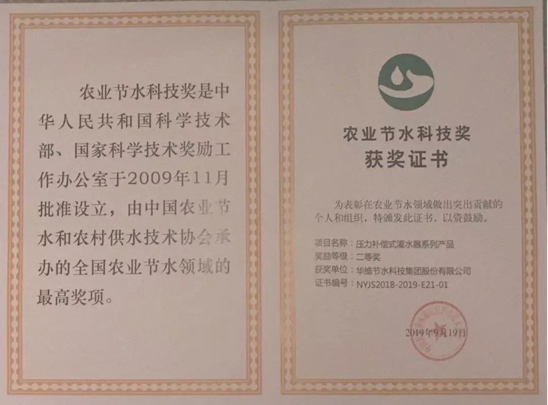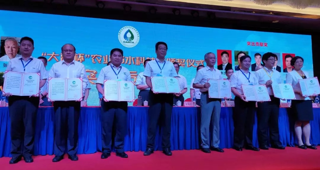 水利部牧区水利科学研究所、湖北省水利水电科学研究院、甘肃省水利科学研究院、华维集团(左)等荣获农业节水科技奖二等奖