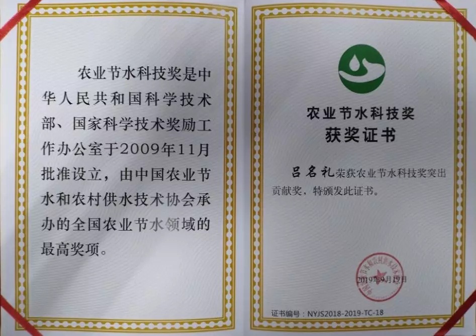2019年9月21日,由华维集团承办的全国农业节水和农村供水技术发展高峰论坛在长沙召开,会议开幕式上举行了农业节水科技奖颁奖大会,华维荣获农业节水科技奖二等奖、董事长吕名礼荣获农业节水科技奖突出贡献奖两个重磅奖项。(农业节水科技奖是经科技部、国家科学技术奖励工作办公室批准,由中国农业节水和农村供水技术协会承办的全国农业节水领域的最高奖项,是我国农业节水领域的唯一奖项。)