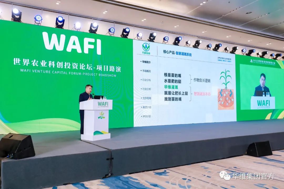 世界农业科技创投论坛-项目路演是2023世界农业科技创新大会(WAFI)的重要专题论坛之一,并于11月2日举办,华维集团董事长吕名礼带来了《智慧灌溉与可控农业项目》。