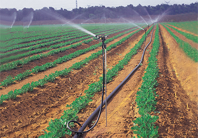 该项目分置于两个农场,单个农场基地就绵延数公里,采用多台套变频控制系统供水,并彼此连通,互为补充。系统采用DN40PE管为支管道,3022系列移动式摇臂喷头为灌水器,喷洒均匀,使用灵活,单位面积投资低。