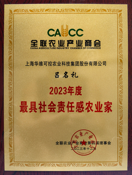 会上,商会对为各自行业、领域做出贡献的会员企业进行了表彰。华维董事长吕名礼获评“2023年度最具社会责任感农业家”。