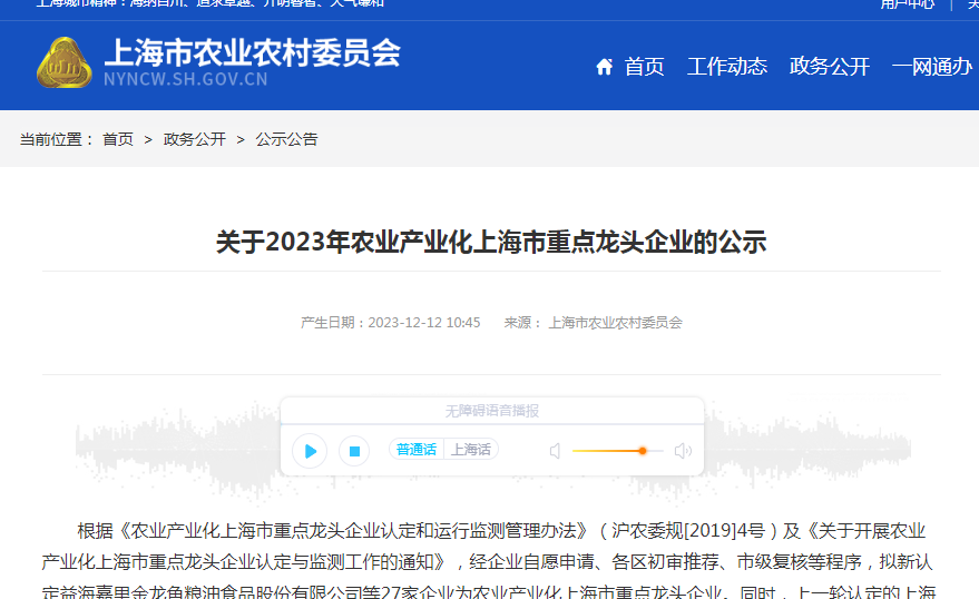 公示地址:https://nyncw.sh.gov.cn/gsgg/20231213/66ba2f95cce44bb0aa3b75c0047423d4.html
