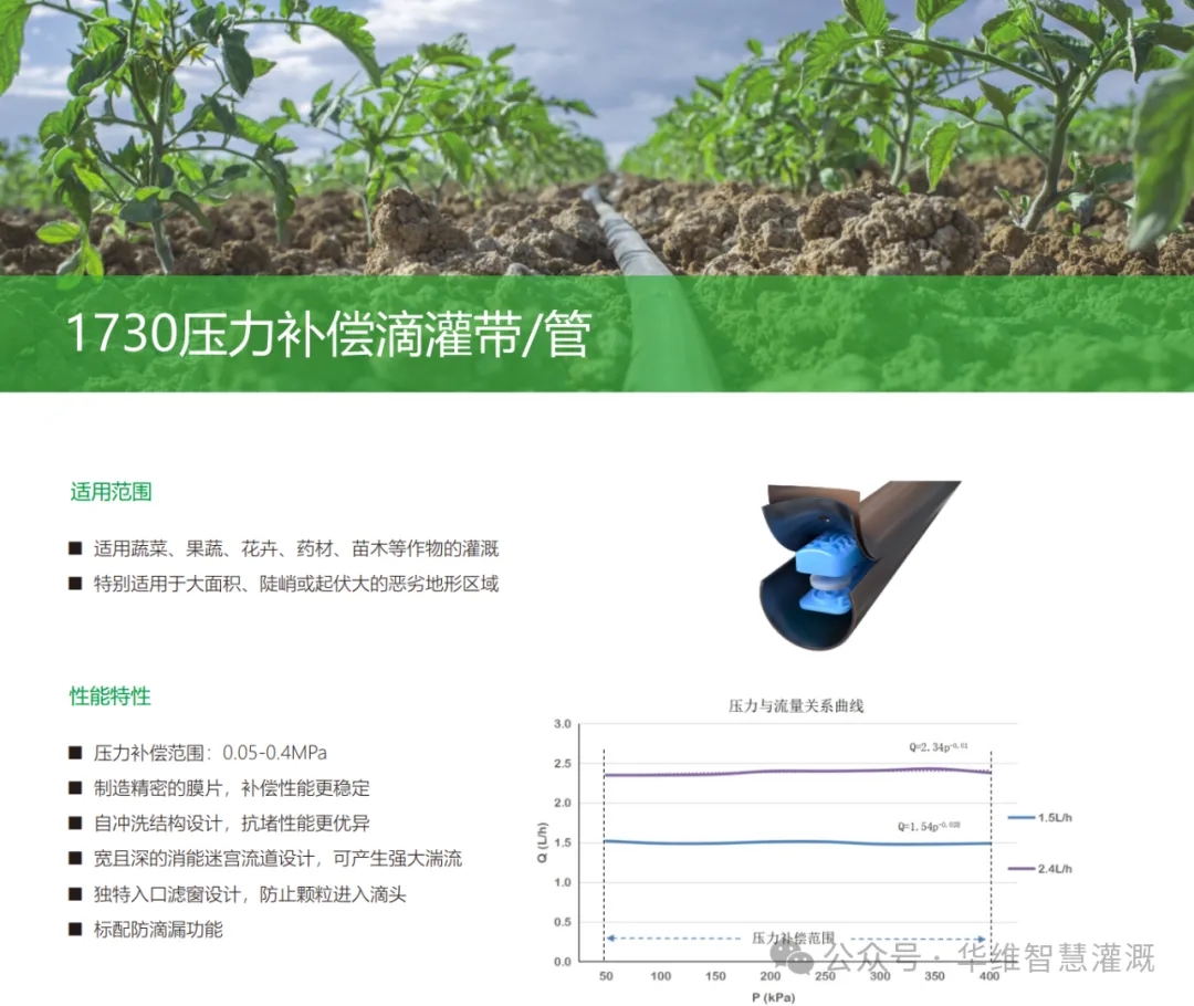如果选择高密度栽培,株距可以使每盆容器几乎连续,一般我们可以采用在作物两侧双排铺设1730压力补偿式滴灌带/管进行灌溉;如果是一般密度栽培,容器间距较大,那么适合使用1828压力补偿滴头结合1800系列滴箭一分四进行灌溉,那么经过长期或每日多次短时间的灌溉后,水应从基质的底部流出。