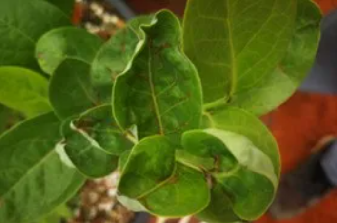 蓟马生命周期短,在理想条件下仅为18-22天,1年可以完成几代,且花蓟马喜欢聚居在一起。蓟马是基地主要的虫害对象,其主要分布在叶表面,但是背部也会分布,打药有时不能打到背部,不能完全控制。其取食叶片导致叶片皱缩(见图三),对于叶芽而言,会导致后长叶片蜷缩不能完全打开。