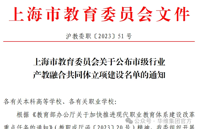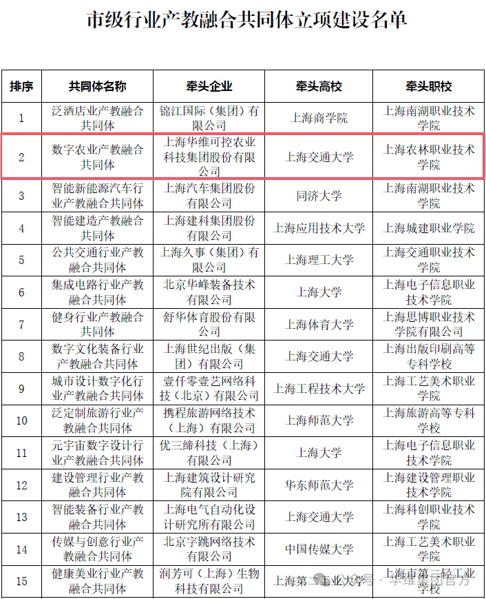 2023年4月15日,由华维科技、上海交大、上海农林申报的“全国数字农业产教融合共同体”成立。年底,该共同体获批成为上海市行业产教融合共同体。