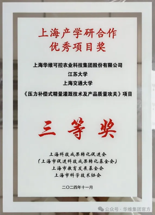 12月11日,2024年“上海产学研合作优秀项目奖”表彰大会召开。华维集团“压力补偿式精量灌溉技术及产品质量攻关”项目荣获三等奖。