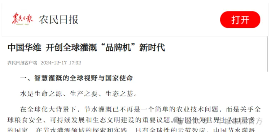 近日,中国三农第一报《农民日报》从华维全球“灌溉品牌机”模式展开分析了智慧灌溉领域的政策支持、市场现状,及行业面临的挑战。报道了华维通过科技创新和产业实践,在全球范围内贡献的中国智慧和中国方案。
