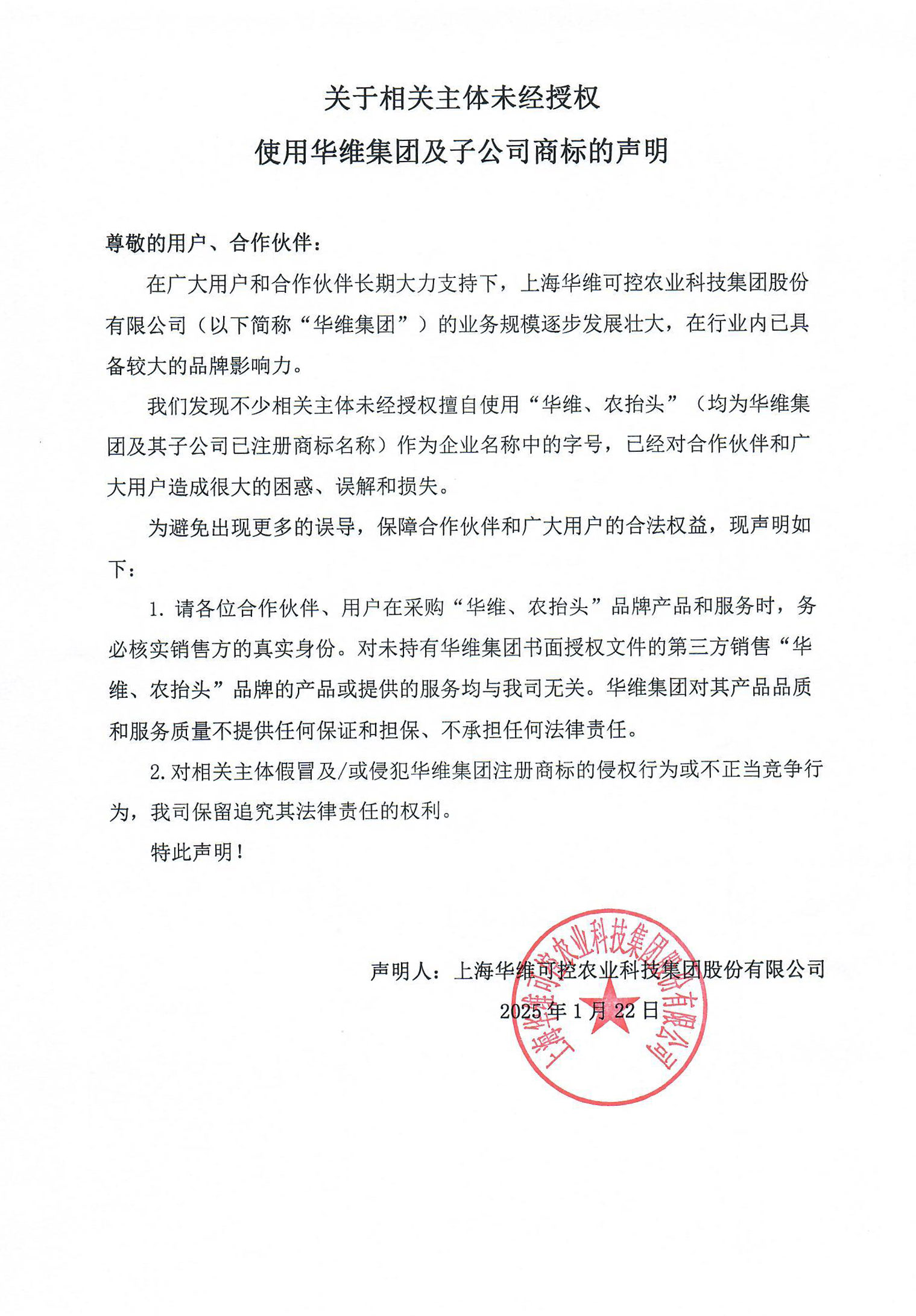 我们发现不少相关主体未经授权擅自使用“华维、农抬头”(均为华维集团及其子公司已注册商标名称)作为企业名称中的字号,已经对合作伙伴和广大用户造成很大的困惑、误解和损失。