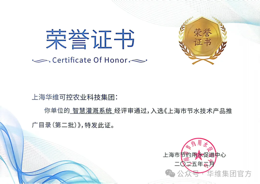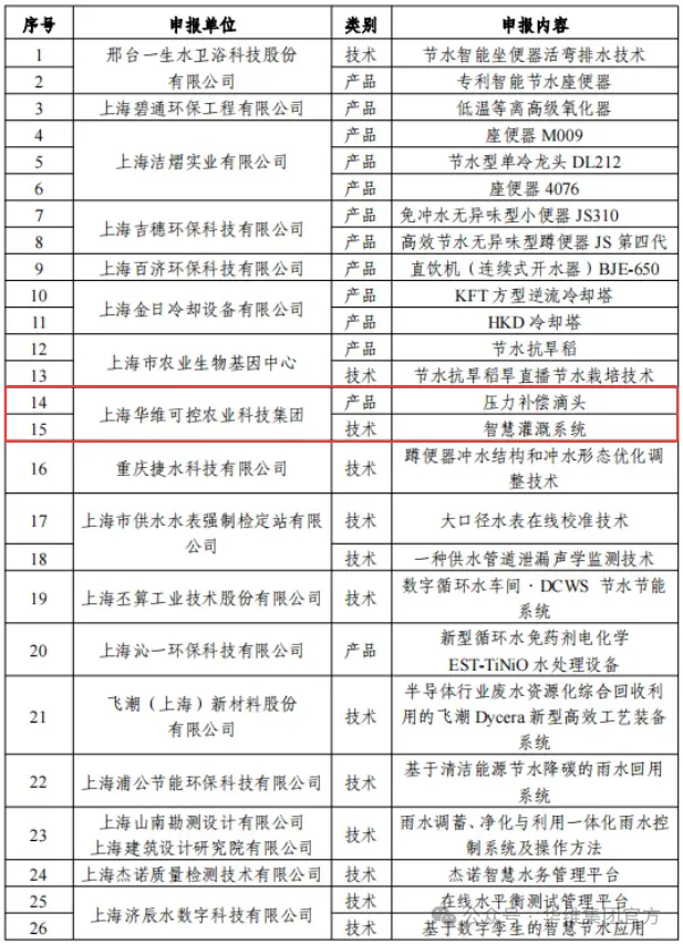 为贯彻落实《国家节水行动方案》目标任务,促进节水技术产品推广应用,上海市供水管理事务中心(上海市节约用水促进中心)、上海市能效中心(上海市产业绿色发展促进中心)组织开展了《上海市节水技术产品推广目录(第二批)》的征集和评审工作,华维智慧灌溉系统和压力补偿滴头等节水技术产品通过了评审,入选《上海市节水技术产品推广目录(第二批)》名单。