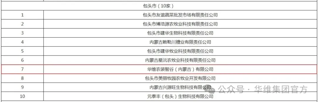 根据《关于开展2024年度自治区农牧业产业化重点龙头企业监测和认定申报工作的通知》要求,依据《内蒙古自治区农牧业产业化重点龙头企业认定和运行监测管理办法》规定,经旗县组织申报、盟市初审、实地抽查、第三方审核、专家评审、联席会议审核、公示等程序,内蒙古自治区农牧厅近日公布了第十批自治区农牧业产业化重点龙头企业名单,华维集团子公司——华维农装智谷(内蒙古)有限公司光荣上榜。