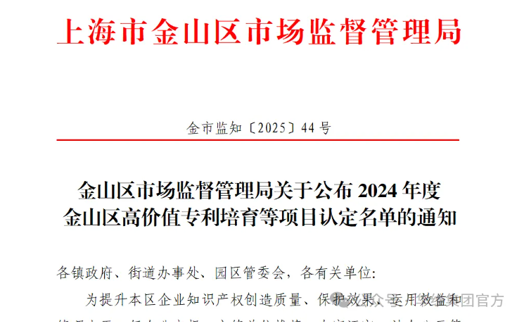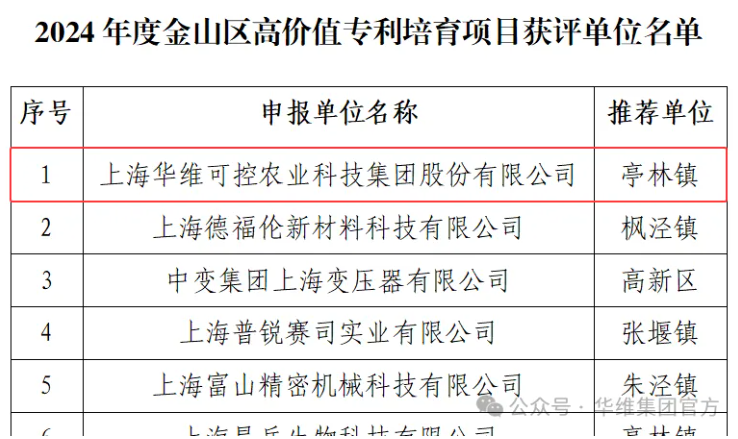 近日,金山区市场监督管理局公布了“2024年度金山区高价值专利培育等项目名单”,华维集团通过认定。此前,华维已获得“国家知识产权优势企业、上海市中小企业高价值专利产业化示范单位、上海市专利工作示范企业、上海市专利工作试点企业、上海知识产权创新奖”等知识产权的相关荣誉。