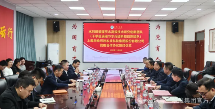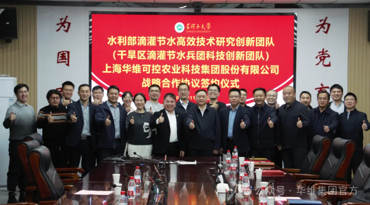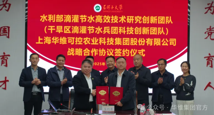 近日,华维集团与水利部滴灌节水高效技术研究创新团队(干旱区滴灌节水兵团科技创新团队,下简称水利部创新团队)战略合作协议签约仪式在新疆生产建设兵团第八师石河子市举行。石河子市发改委、水利局相关领导,石河子大学水利建筑工程学院师生代表,华维集团董事长吕名礼及相关核心管理团队共同见证了这一行业盛事。水利部创新团队负责人王振华教授主持了签约仪式,受聘担任华维研究院及上海节水灌溉工程技术研究中心专家委员会副主任。
