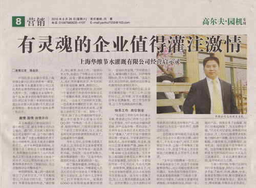 《中国花卉报》6月26日发表署名文章(http://news.china-flower.com/paper/papernewsinfo.asp?n_id=214316),对上海华维节水灌溉有限公司进行了专题报道,着重反映了华维公司作为一个专业的灌溉企业,在公司经营过程中坚守的“诚信、激情、活力”等特有的企业文化。