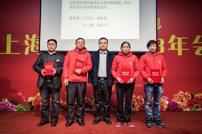 颁奖嘉宾(左一)与员工代表(右一)一起为优秀员工颁奖并留影