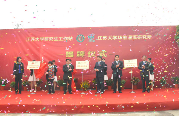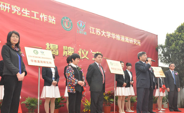 江苏大学校长袁寿其教授、农业部全国农技中心节水农业技术处处长高祥照博士、上海市农业委员会农机化办施忠主任、中国水利企业协会灌排设备企业分会许复初秘书长、江苏大学流体机械工程技术研究中心主任李红教授、上海华维节水灌溉有限公司吕名礼董事长共同为研究所等揭牌。