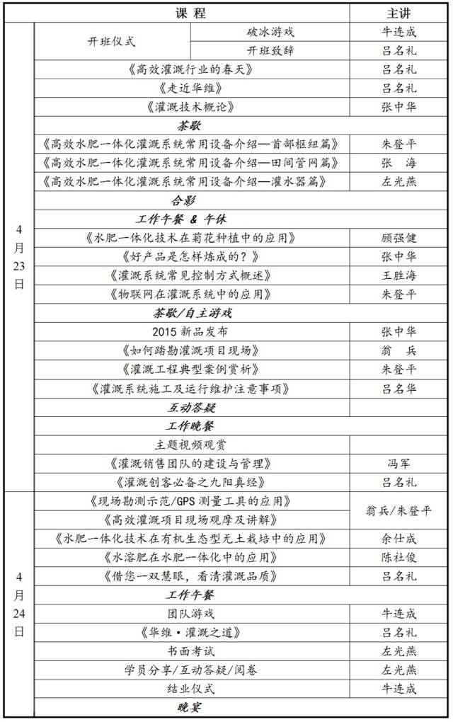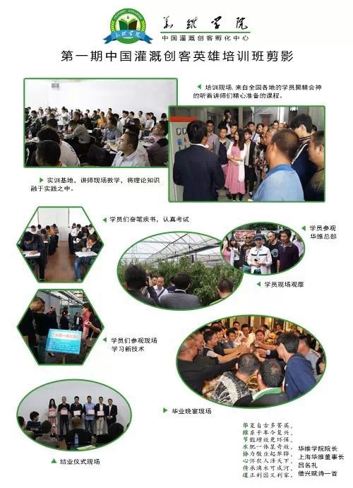 开办华维学院以及中国灌溉创客培训班,旨在把华维的经验传授给更多有志于从事高效灌溉事业的同道者,通过大家再将这一革命性的农业技术推广到全国各地、世界各地,解放更多的种植者,让他们能轻松、持续地赚大钱,在服务种植者的过程中,自然地得到丰厚的回报、成就自己的事业。