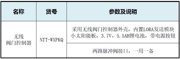 采用无线阀门控制器外壳,内置LORA发送模块,小太阳能板,3.7V、5.5AH锂电池,带电源按钮。两路脉冲阀接口,一用一备。