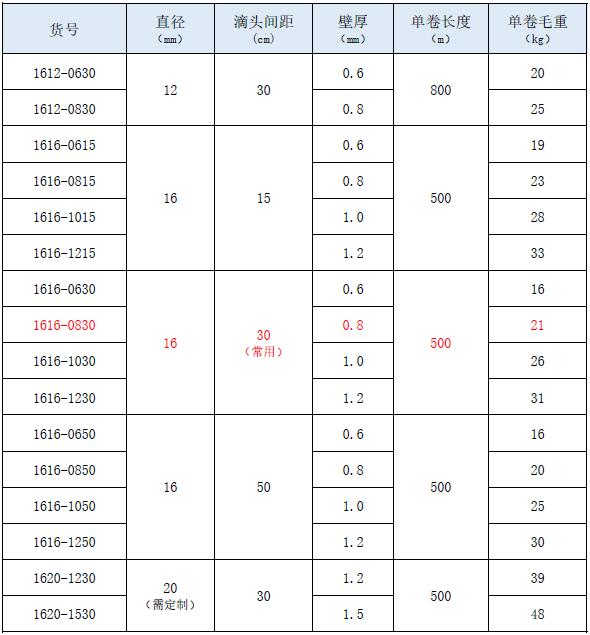 常用滴灌管为Φ16,滴头流量有2L/h、4L/h;Φ12适合于日光温室等短行铺设,经济实用,滴头流量有1L/h、2L/h;Φ20为华维特色产品,沿程水头损失小,适用于高速公路绿化灌溉等长距离铺设。