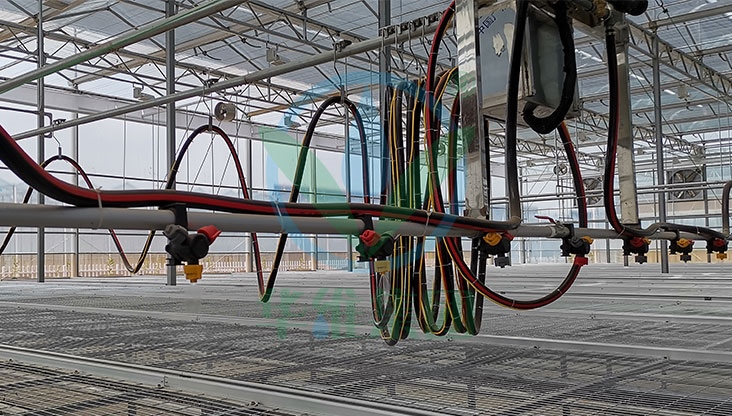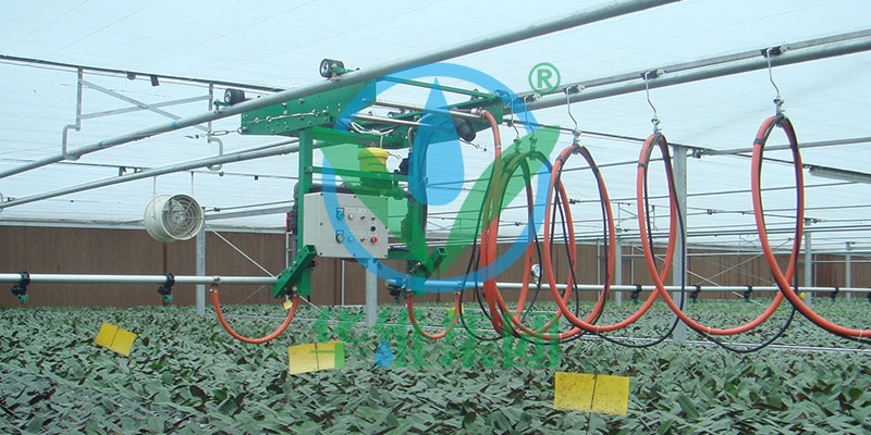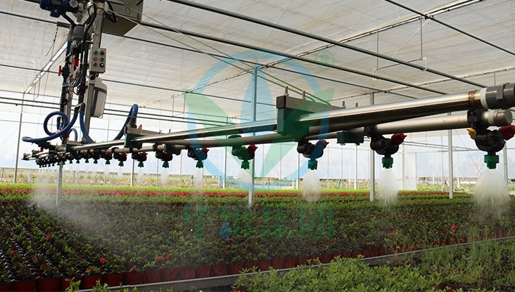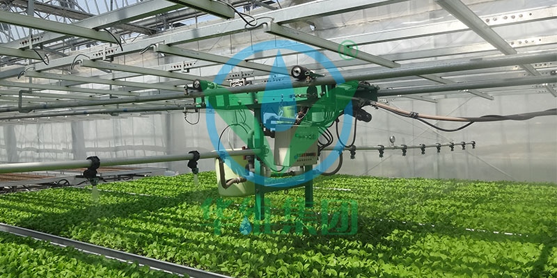 喷灌机在悬挂于温室顶部的轨道上运行,进行灌溉作业,以减少对温室其他作业的影响;同时喷灌机可从一组运行轨道轻松转移到另一组运行轨道,利用一台喷灌机可实现多跨温室不同区域的灌溉,可大大降低设备投资。