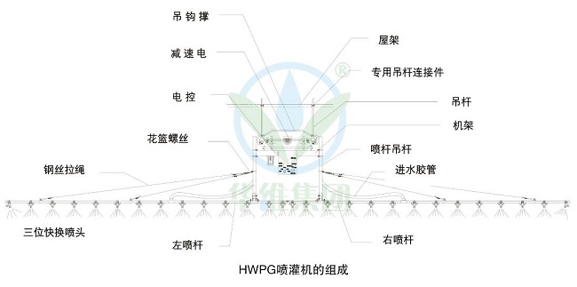 扫码查看视频 悬挂式自走喷灌机,专为温室喷灌设计,有垂管供水(端部供水)方式和平管(中间供水)供水方式。